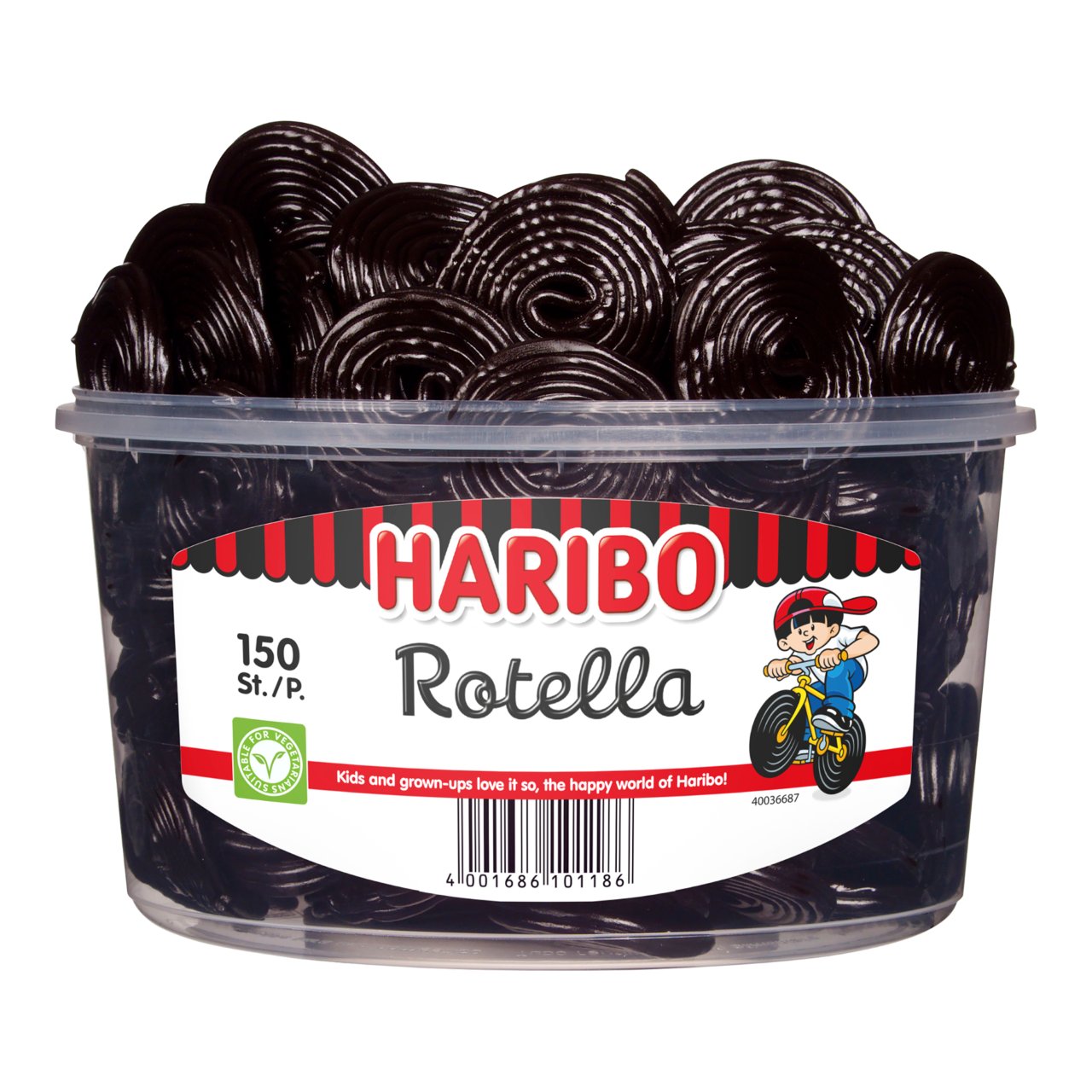 Ingrediënten Haribo Rotella Drop Jojo’s: Bruine suikerstroop, TARWEMEEL, glucosestroop, zetmeel, zoethoutextract (3%), aroma, zout, glansmiddelen: bijenwas wit en geel, carnaubawas Kan sporen bevatten van melk.